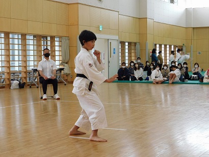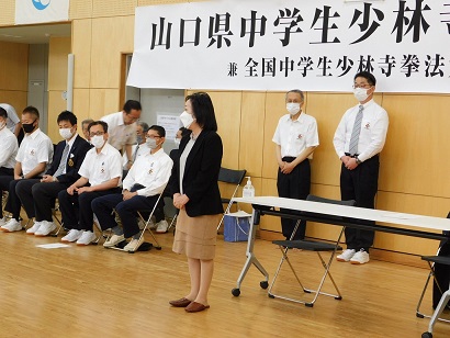 山口県少林寺拳法連盟会長代理として山口県少林寺拳法連盟副会長の陰山和子様のご挨拶の後競技に入った。競技は女子単独演武、男子単独演武、女子組演武、男子組演武の順で行った。今回は気合ありにしたことにより昨年より気迫の感じられた大会となった。