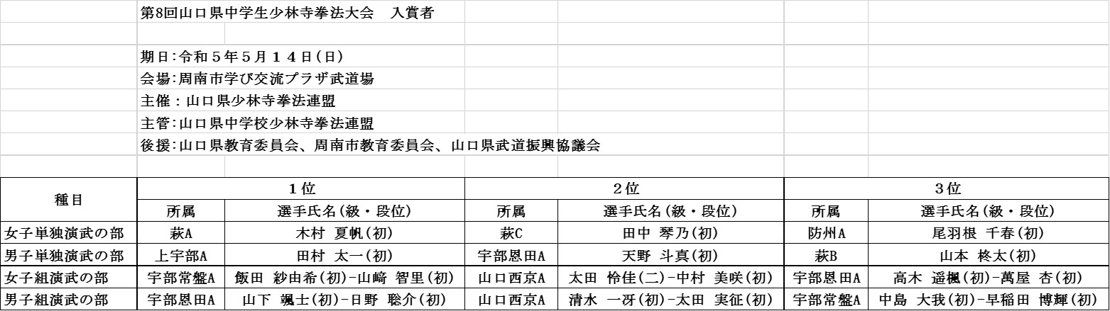 入賞された拳士は8月の全国大会に向けて更に技に磨きを掛けていただきますようお願い致します。