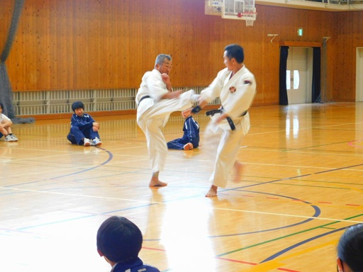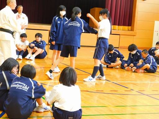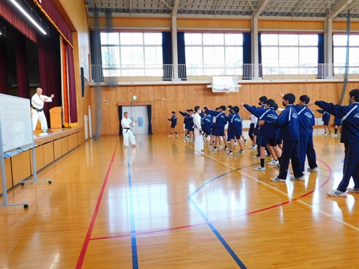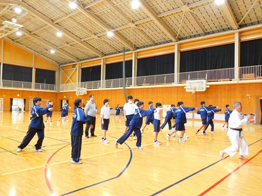 授業は、2年生41名、1年生65名をそれぞれ2時間づつ行い、ウォームアップから基本諸法、法形は2年生は上受突と切抜、1年生は内受突と小手抜を体験していただきました。また、後半は2年、1年共3人一組になり、1人が観察者で2人の実技を見て良いところを出し合うことを行い、楽しく授業をすることができました。