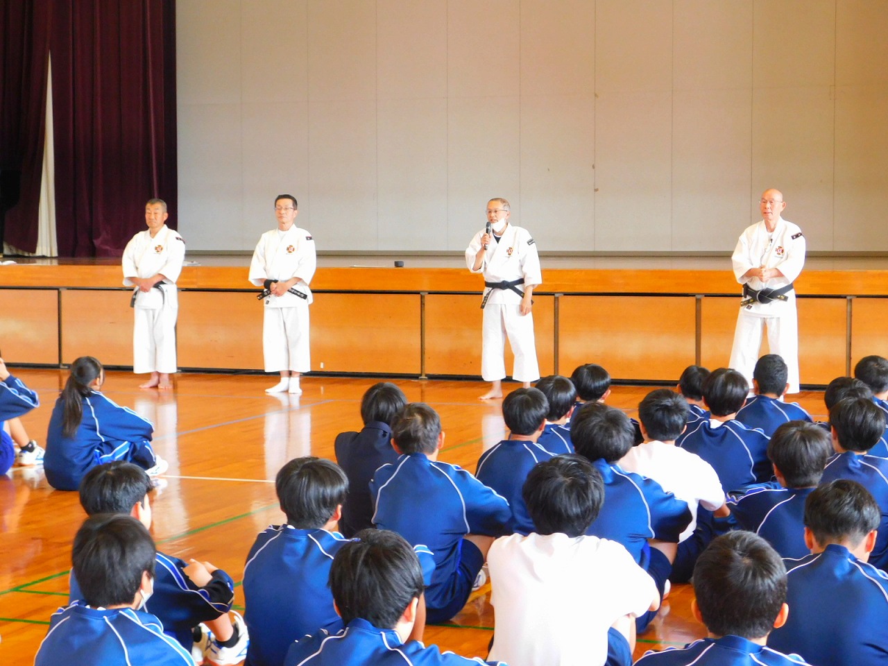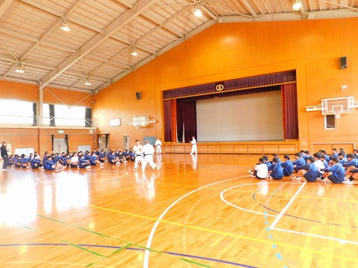 授業は、2年生217名を3クラスづつ2回に分け、それぞれ2時間おこないました。今回は周南市内の指導員4名で指導に当たり、自己紹介の後、ウォームアップから演武披露、基本諸法、法形は内受突と小手抜を体験していただきました。また、後半は1人が観察者で2人の実技を見て良いところを出し合うことを行い、楽しく授業をすることができました。