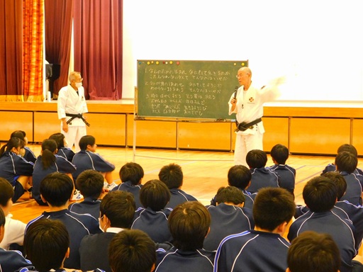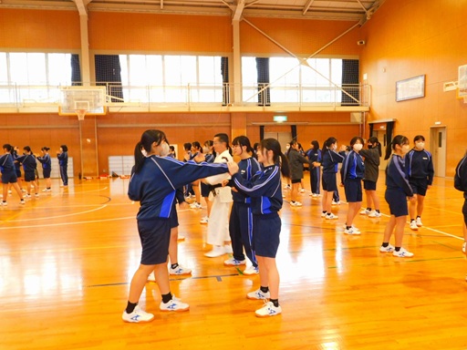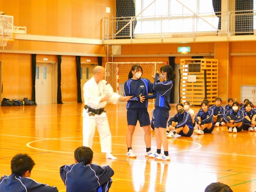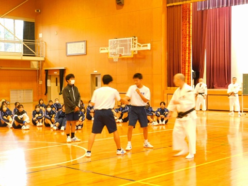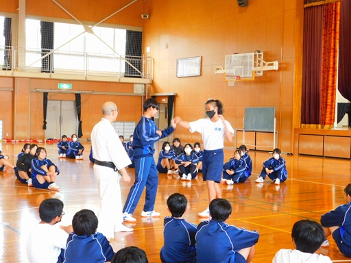 生徒の感想では、「武道の本来の意味が分かった。」「少林寺拳法について知ることができた。」「悪い人に捕まったら小手抜で逃れるようにしたい。」等があり、短時間の授業でしたが、真剣に取り組んでもらった成果があったように思います。