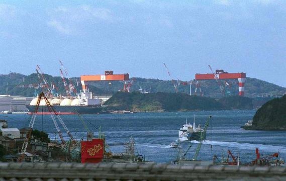 三菱重工業長崎造船所の世界最大級100万トンドックがあり、主に香焼の工場では、大型タンカーや貨物船が建造されている。グラバー邸より撮影。