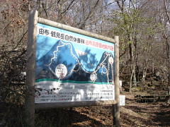 登山口案内板 山道へ入る扉を開けると案内板がある ここから正面登山道と東登山道に分かれる |