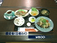 昼定食(日替わり)800円。メバルの唐揚げ、冬瓜の煮物、山芋と肉のソテー、ハモと茄子の味噌汁、デザート、コーヒー。