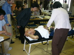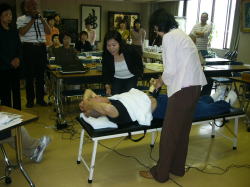 ビワ温圧器の取り扱い方の説明に熱心に聞き入る参加者の人たち。皮膚の患部の色が赤く変わる様子を見ることが出来ました。患者さんは、何時までも体が温かく何時までもほかほかと焼き芋状態になって気持ちよかった、との事。