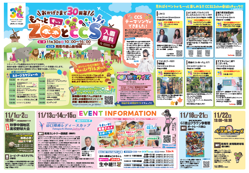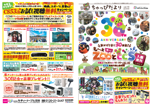 今回はシティーケーブル周南の会社設立30周年記念イベント「も~っと!ZOOっと!CCS」についてのご紹介をメインに、女子プロゴルフの登竜門ツアー「JLPGA2025 ステップ・アップ・ツアー 山口周南レディースカップ」のほか、スポーツを中心とした秋の楽しいイベントをご紹介しています。